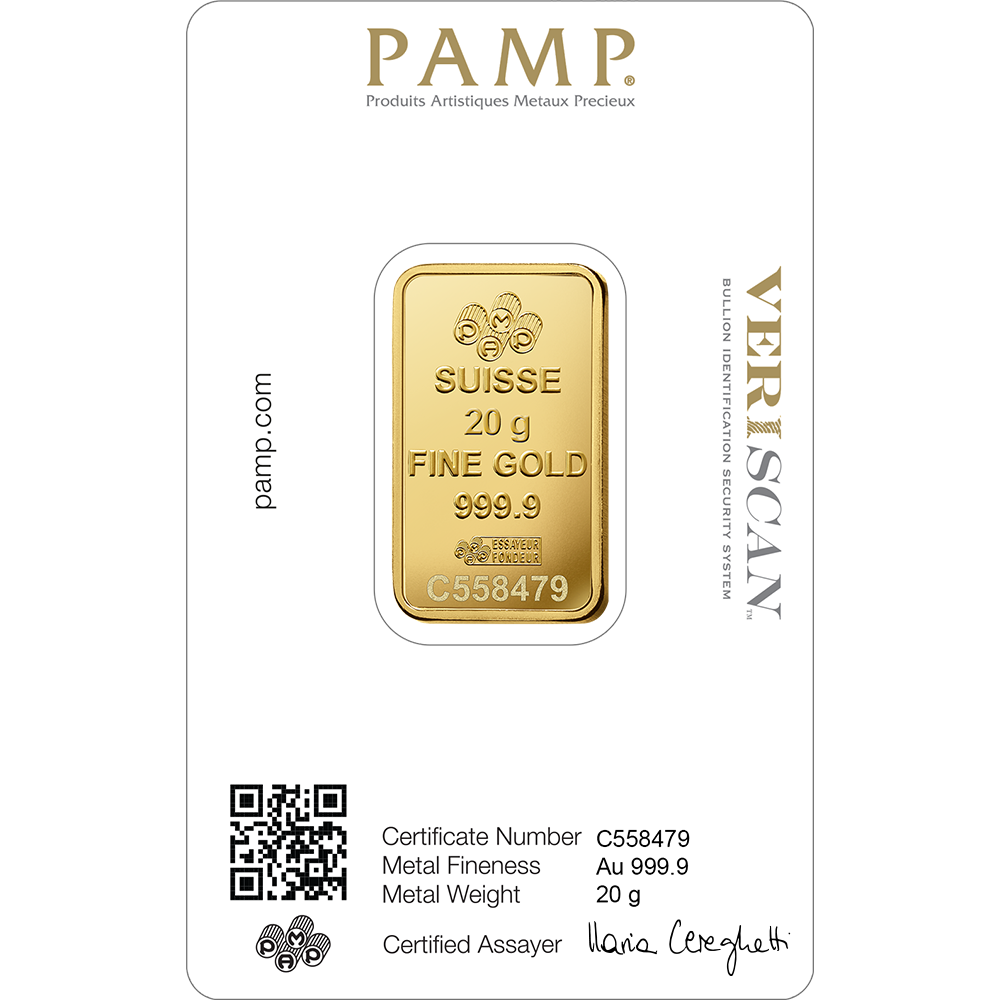 اطلب الآن سبيكة PAMP Gold Bar 20g من سبكسا مع شحن آمن وسريع لجميع أنحاء المملكة.